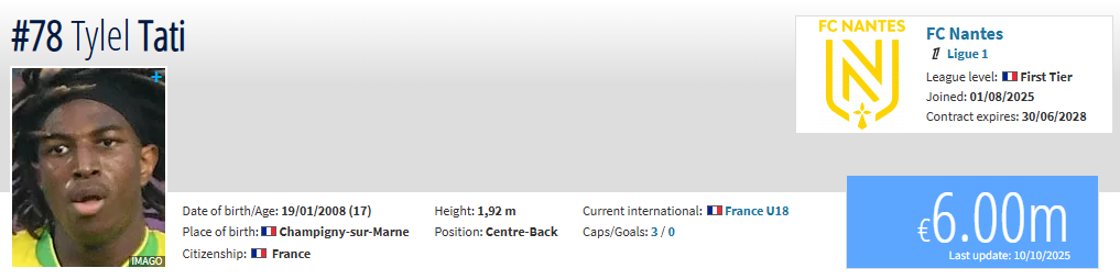 Tati’s rise has been nothing short of remarkable. Born in 2008, the young Frenchman has already earned valuable senior minutes for Nantes, showcasing maturity and composure well beyond his years. It’s this early exposure to top-flight football that has put him firmly on the radar of Europe’s elite.