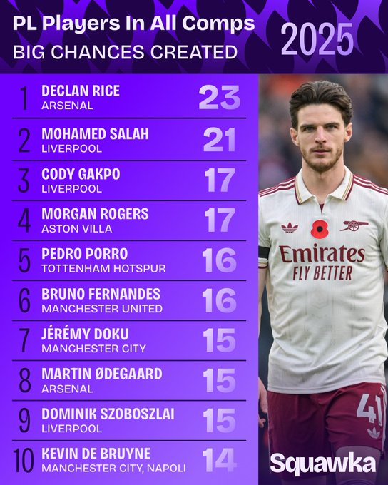 The England international has created more big chances than any other Premier League player across all competitions in 2025 (23), more than Mohamed Salah (21) and even teammate Martin Ødegaard (15).