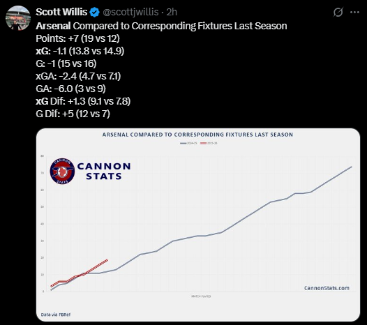When comparing Arsenal’s performances to corresponding fixtures from last season, the improvement is undeniable. As shown by Scott Willis below, the Gunners are not only grinding out results, they’re doing so with consistency, structure, and belief.