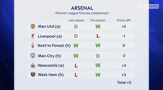 - Arsenal have improved by +5 points when comparing identical fixtures from last season.